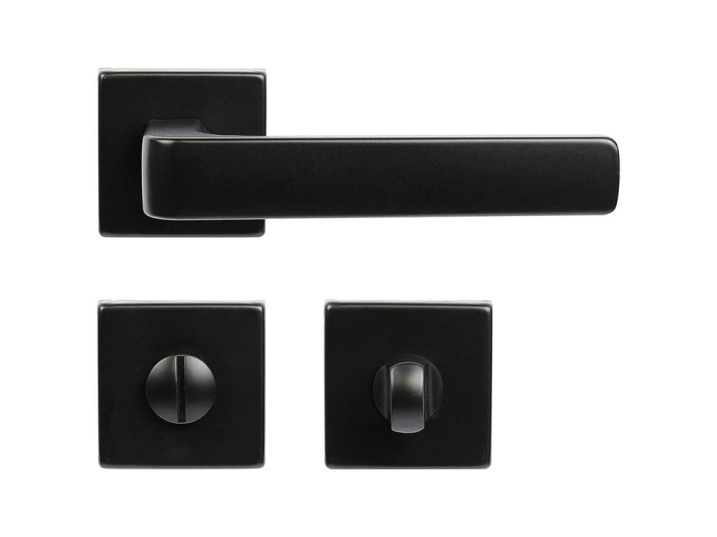 Dveřní ocelové kování se čtvercovými rozetami v černém matném povrchu.