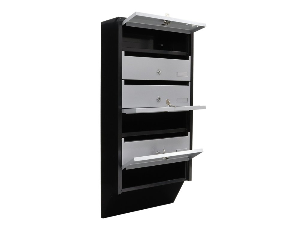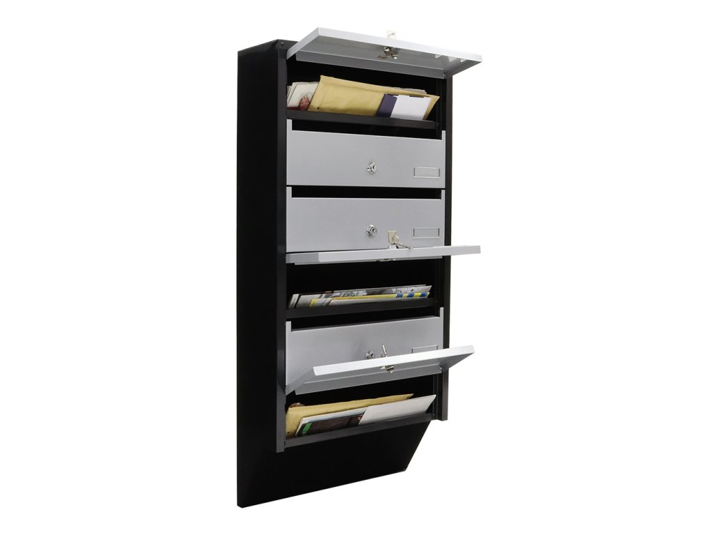 Poštovní schránka DEPOT 6 obsahuje 6 samostatných složek. Každou složku je možné uzamknout a ke každé složce se dodávají 2 klíče. Jednotlivé složky mají v pravé dolní části prostor na jmenovku a velké přední dvířka na vyzvednutí doručené pošty, které se otvírají směrem nahoru. Poštovní schránka Depot 6 je vhodná pro bytové domy a polyfunkční objekty. Na zadní straně jsou připravené otvory na upevnění. Materiál na upevnění je součástí balení.