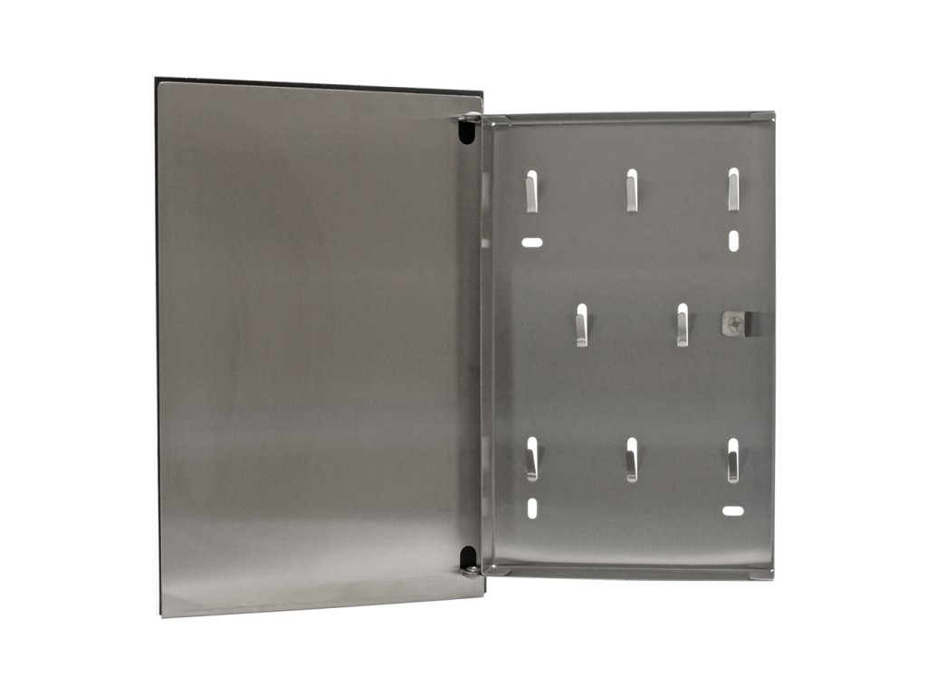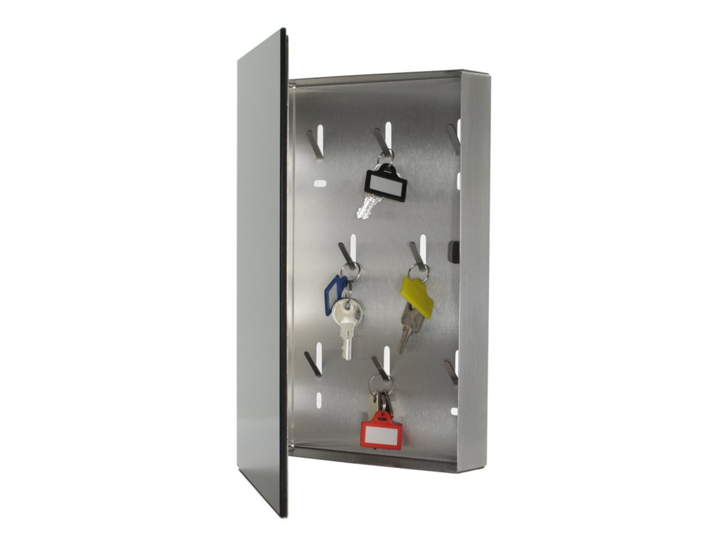 Skříňka na klíče KEY GLASS upoutá moderním designem se skleněnými předními dvířky a zavíráním na magnet. Uvnitř skříňky je prostor pro 8 klíčů. Součástí balení je i držák s magnetem a perem. Na skleněná magnetická dvířka můžete napsat informaci perem nebo můžete připevnit vzkaz magnetem. Balení obsahuje potřebný kotvící materiál pro připevnění na stěnu. Na zadní straně se nachází otvory na ukotvení.