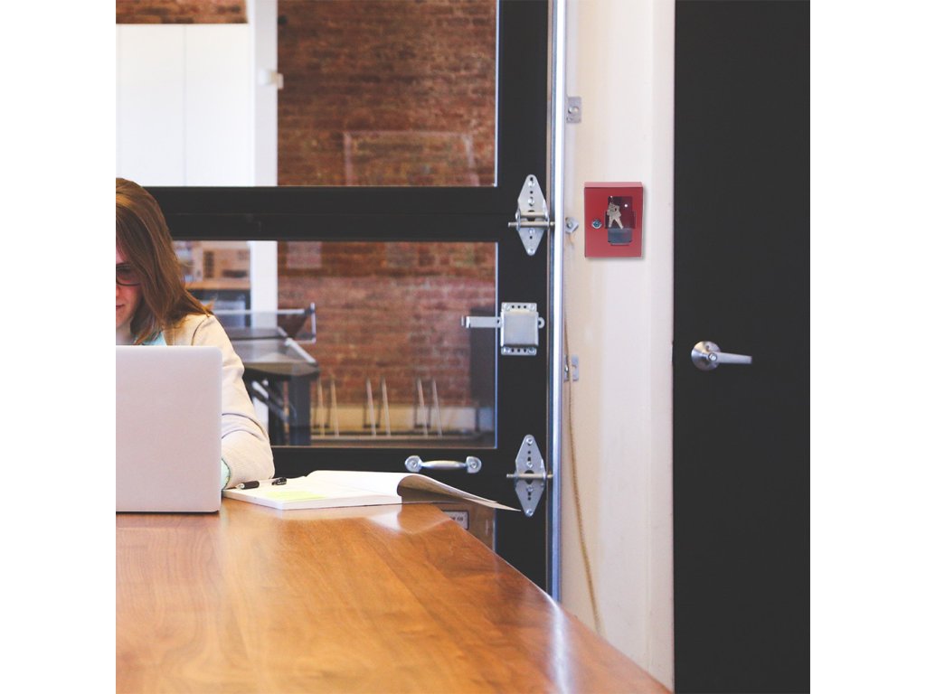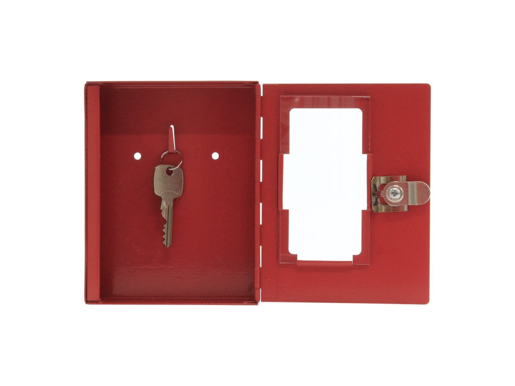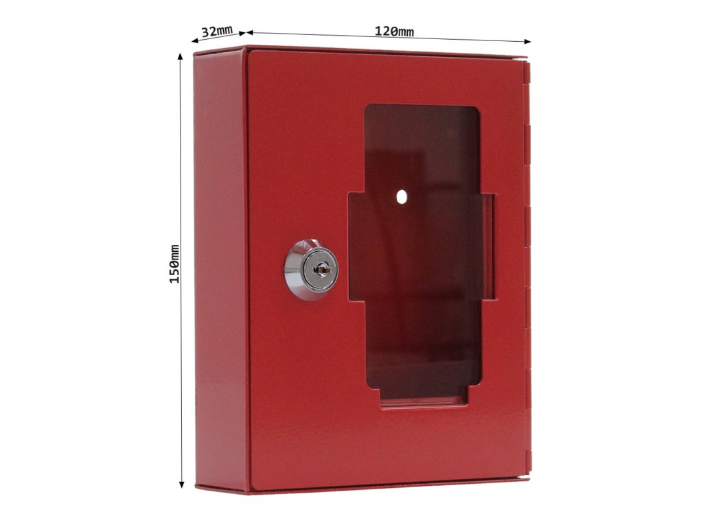 Červená skříňka na klíč, která se používá na uschování důležitého klíče nebo svazku více klíčů. V případě potřeby je možné sklo rozbít pomocí kladívka. Balení obsahuje materiál na ukotvení skříňky na stěnu.