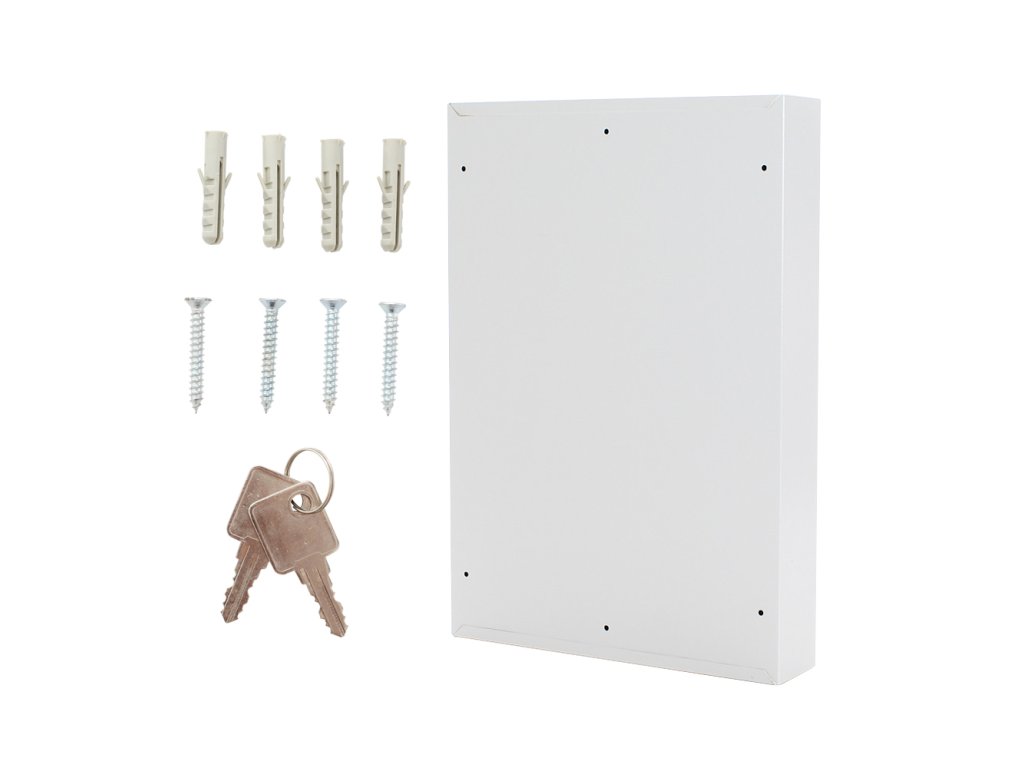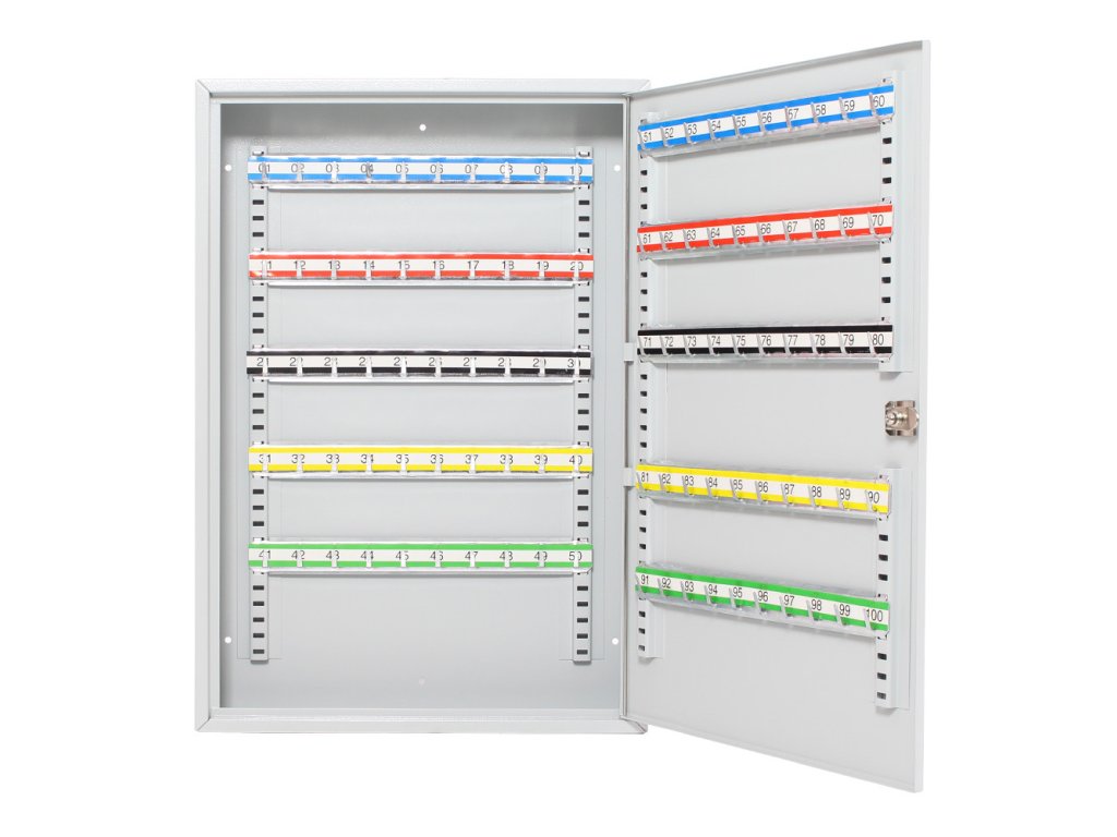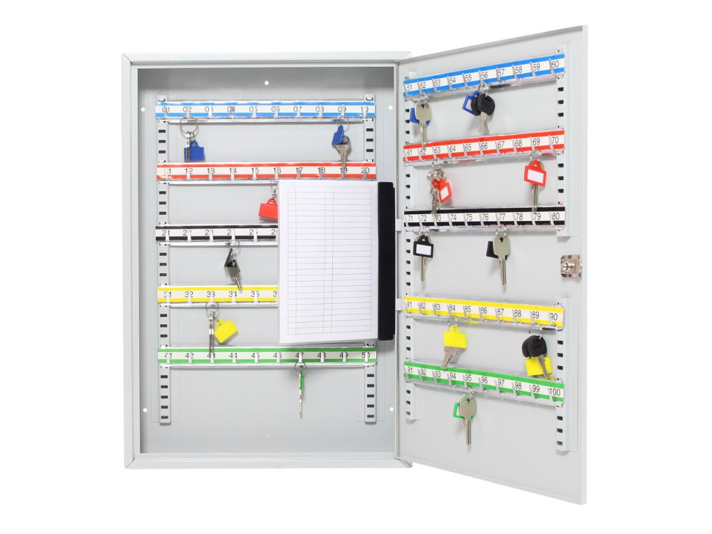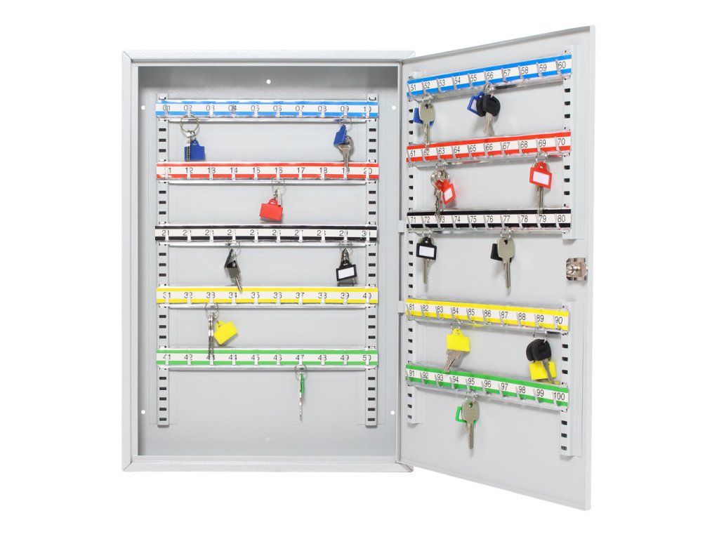 Skříňka na klíče S100 umožňuje přehledné uspořádání klíčů. Je vyrobená z kvalitního ocelového plechu a obsahuje prostor na 100 pozinkovaných háčků na klíče. Lišty, na kterých jsou háčky upevněné je možné vertikálně posouvat. 100 barevných visaček je možné použít pro lepší evidenci. Balení obsahuje potřebný kotvící materiál pro připevnění na stěnu.