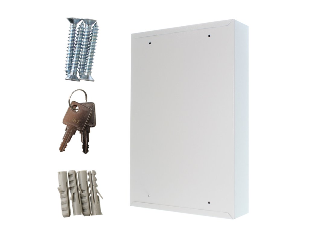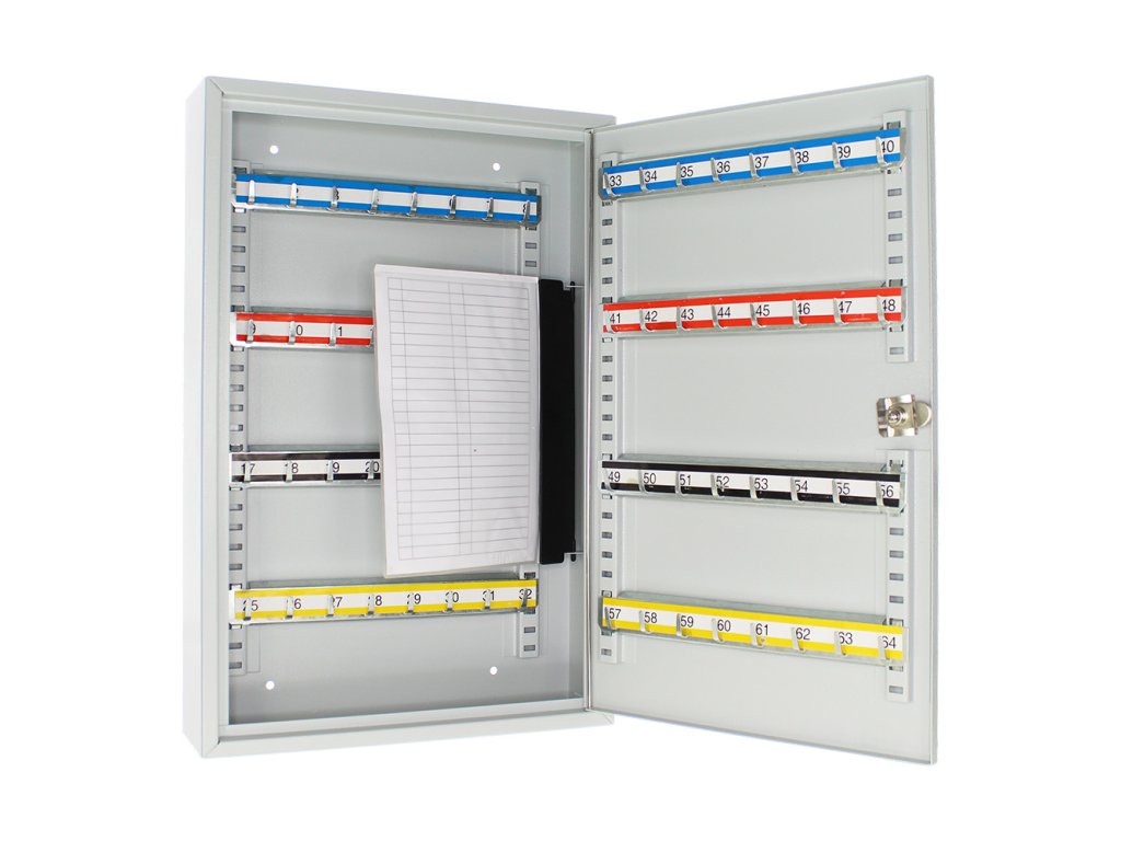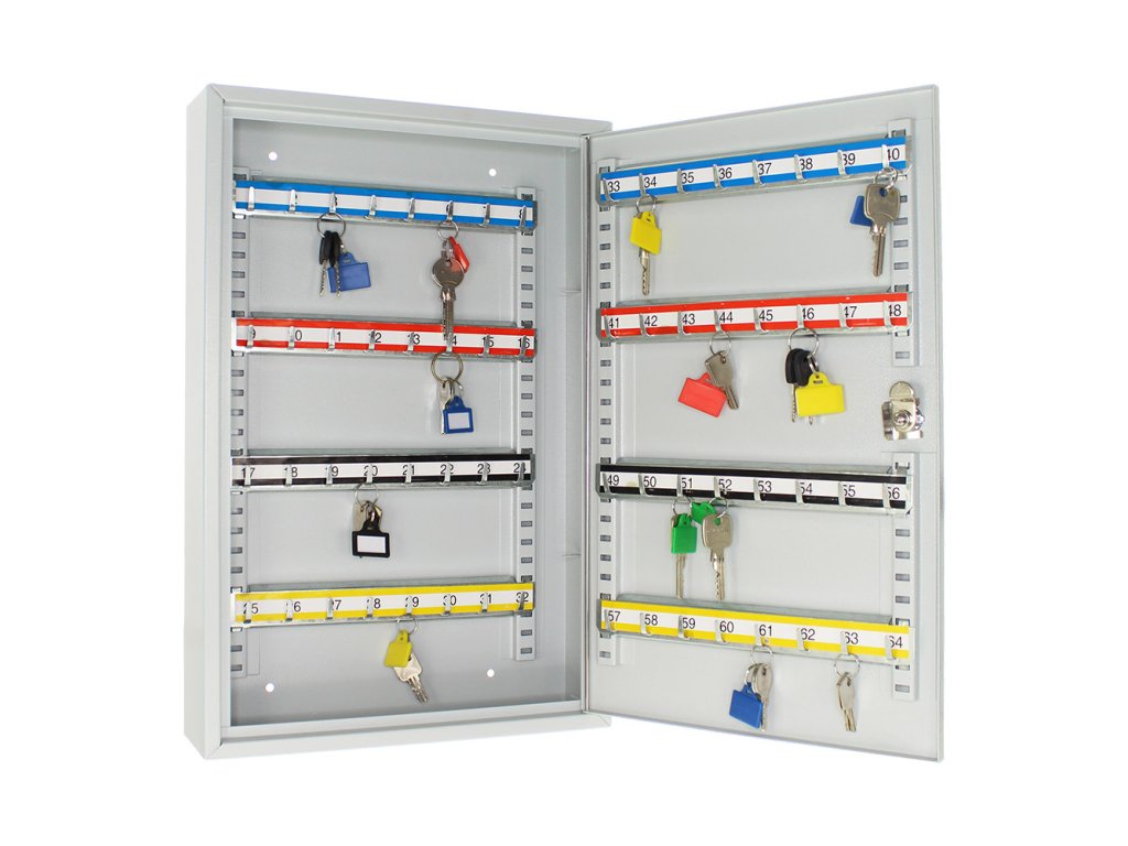 Skříňka na klíče S100 umožňuje přehledné uspořádání klíčů. Je vyrobená z kvalitního ocelového plechu a obsahuje prostor na 100 pozinkovaných háčků na klíče. Lišty, na kterých jsou háčky upevněné je možné vertikálně posouvat. 100 barevných visaček je možné použít pro lepší evidenci. Balení obsahuje potřebný kotvící materiál pro připevnění na stěnu.