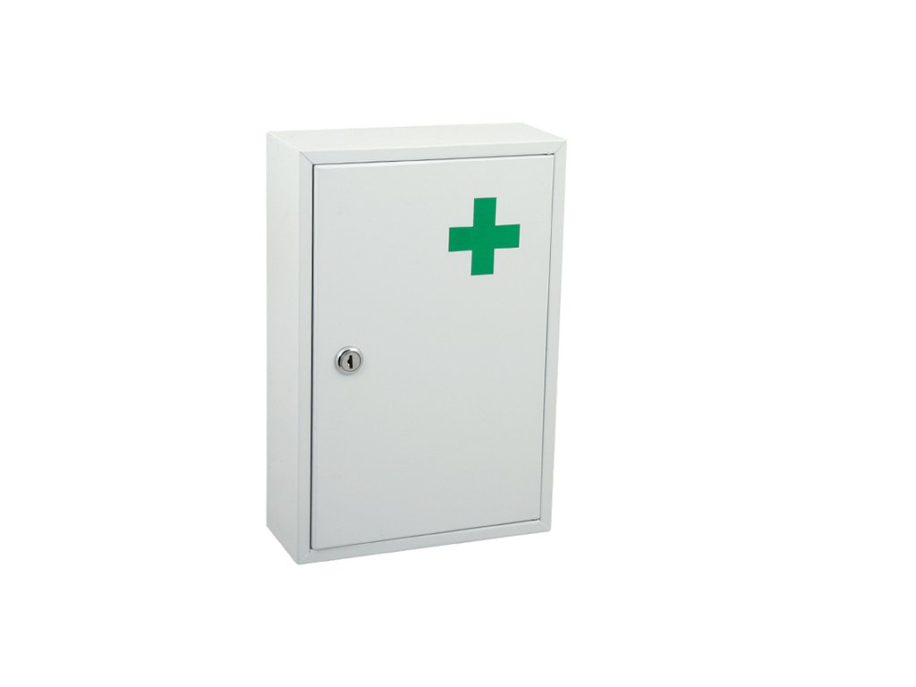 Nástěnná lékárnička je vyrobena z pozinkovaného plechu ošetřeného práškovou vypalovací barvou.