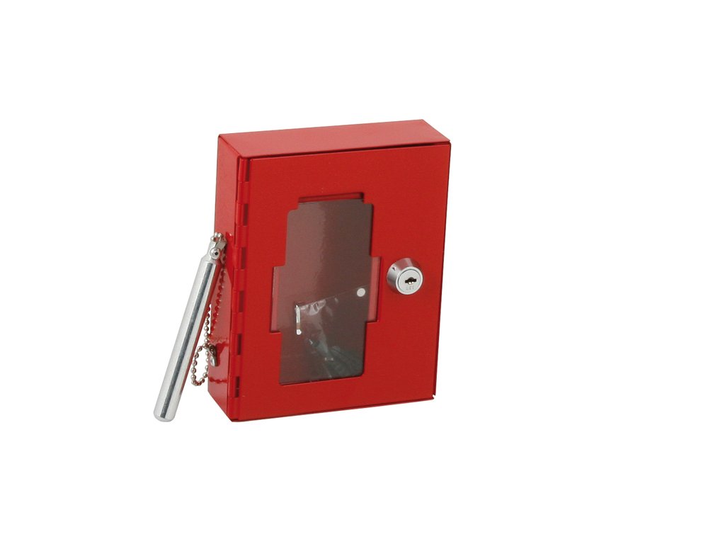 Skříňka na požární klíč je vyrobena z ocelového plechu ošetřeného práškovou vypalovací barvou - signální červená.