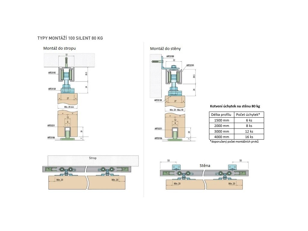Pro montáž do stěny je nutné si zakoupit samostatně úchytky na montáž kolejnice (ART. 0189). Úchytky nejsou součástí balení.