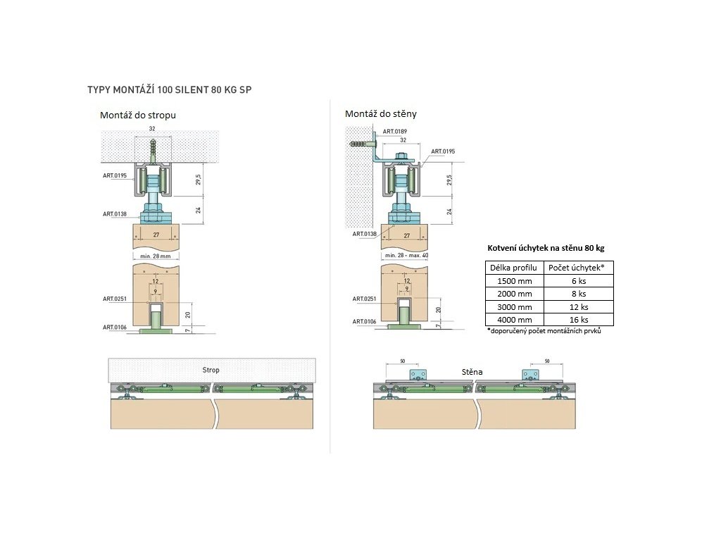Sety SILENT 100 jsou moderním systémem pro posuvné dveře s vlastnostmi jako tichý chod, bezúdržbová funkčnost a zvýšená bezpečnost díky zpomalenému zavírání dveří. Hliníkové nebo dřevěné dveře s tímto posuvným systémem zaberou jen 0,1 m2, což oceníte hlavně v malých interiérech. U těchto posuvných systémů SILENT 100 si vyberete produkty na různé váhy křídel dveří s váhou do 40 - 80 - 120 kg a tloušťkou od 28 mm. Pro kotvení na stěnu je maximální tloušťka dveří vždy 40 mm. Také můžete tento systém doplnit o zpomalovače, které jsou baleny po 2 ks s možností zpomaleného otevírání i zavírání dveří (pro křídla menší než 720 mm lze použít pouze 1 ks zpomalovače).