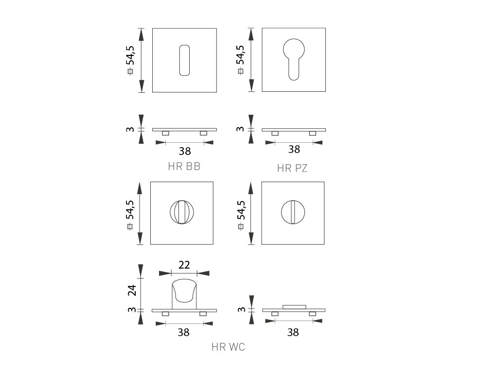 oválný otvor pro interiérový klíč (BB), otvor pro cylindrickou vložku (PZ) nebo WC set s vmontovaným klíčem. Balení obsahuje 2 kusy rozet (pár) a rozety WC jsou v balení jako set.