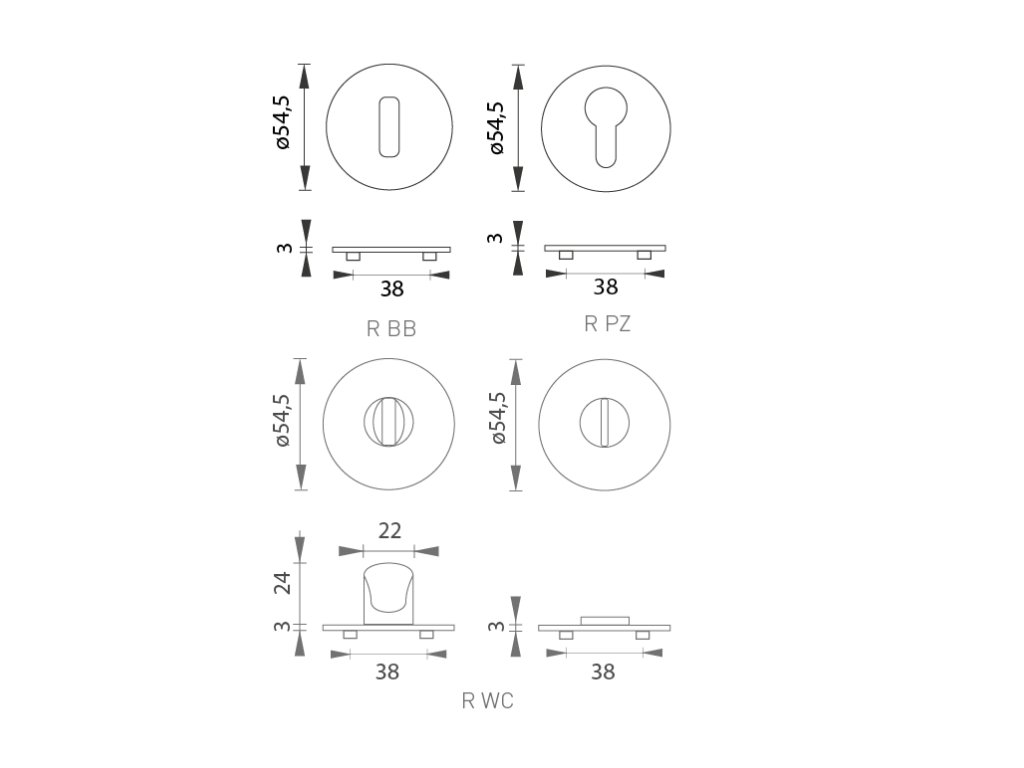 oválný otvor pro interiérový klíč (BB), otvor pro cylindrickou vložku (PZ) nebo WC set s vmontovaným klíčem.