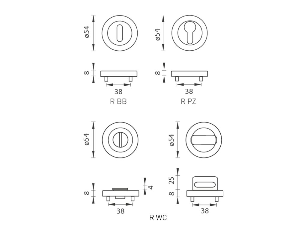 oválný otvor pro interiérový klíč (BB), otvor pro cylindrickou vložku (PZ) nebo WC set s vmontovaným klíčem.
