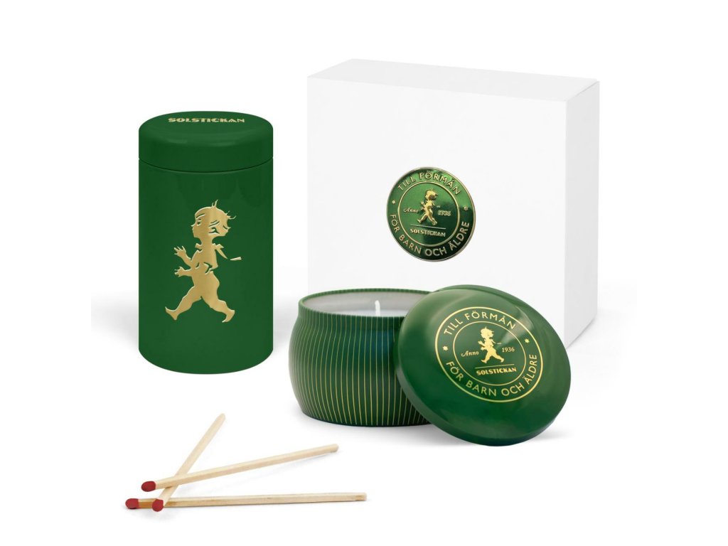 Kulatá kovová dóza na zápalky se jednoduše otvírá a obsahuje 100 kusů extra dlouhých kvalitních zápalek vyrobených ve Švédsku. Ve spodní části je decentně umístěné "škrtátko". Minimalistický severský design je doplněný zlatým emblémem s klasickým švédským motivem chlapce od známého umělce Einera Nermana.