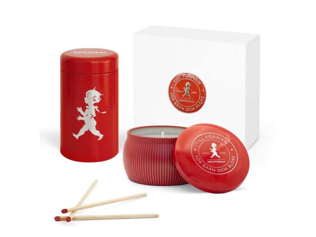 Kulatá kovová dóza na zápalky se jednoduše otvírá a obsahuje 100 kusů extra dlouhých kvalitních zápalek vyrobených ve Švédsku. Ve spodní části je decentně umístěné "škrtátko". Minimalistický severský design je doplněný zlatým emblémem s klasickým švédským motivem chlapce od známého umělce Einera Nermana.