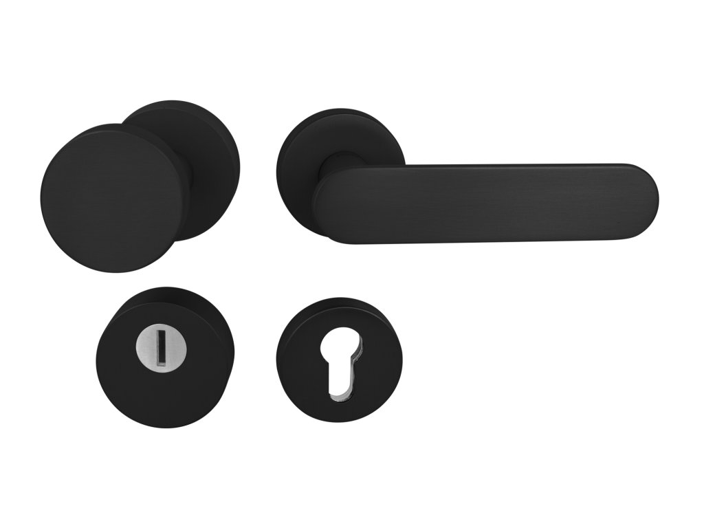Bezpečnostní interiérová rozetová klika na vchodové a bezpečnostní dveře s kulatou rozetou s překrytím cylindrické vložky je vyrobená z materiálů vysoké kvality – zamak / ocel a je povrchově upravená. Kulatá rozeta má průměr 52 mm a tloušťku 17 mm.