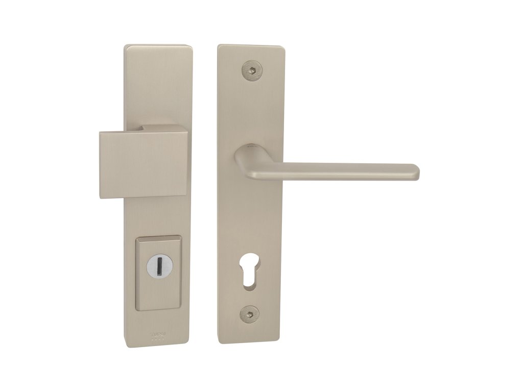Štítová klika na vchodové a bezpečnostní dveře s bezpečnostním hranatým štítem s překrytím cylindrické vložky je vyrobena z materiálů vysoké kvality - zamak a je povrchově upravena. Hranatý štít má rozměry 52 mm x 250 mm a tloušťku 17 mm.