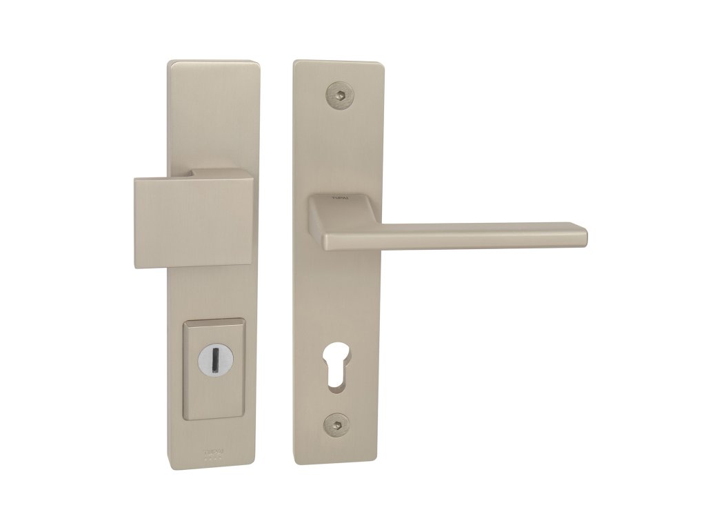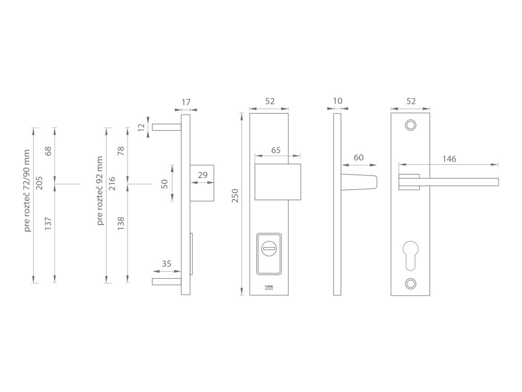 Štítová klika na vchodové a bezpečnostní dveře s bezpečnostním hranatým štítem s překrytím cylindrické vložky je vyrobena z materiálů vysoké kvality - zamak a je povrchově upravena. Hranatý štít má rozměry 52 mm x 250 mm a tloušťku 17 mm.