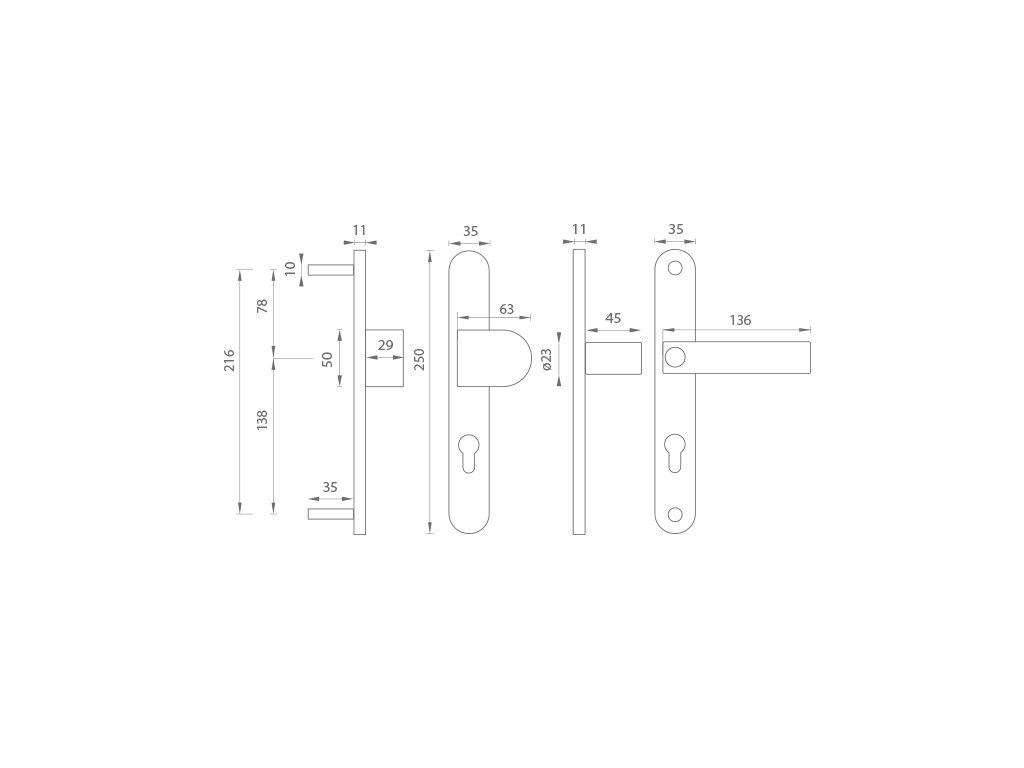 Štítová klika na vchodové a bezpečnostní dveře se zpevněným oválným úzkým štítem bez překrytí cylindrické vložky je vyrobena z materiálů vysoké kvality - zamak a je povrchově upravena. Oválný úzký štít má rozměry 35 mm x 250 mm a tloušťku 11 mm.
