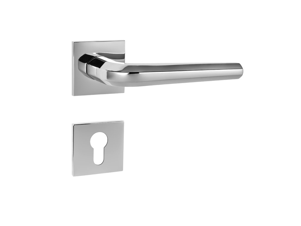 Rozetová klika na interiérové dveře s hranatou rozetou je vyrobena z materiálů vysoké kvality - mosaz a je povrchově upravena. Rozeta má rozměry 52 mm x 52 mm a tloušťku pouze 5 mm.