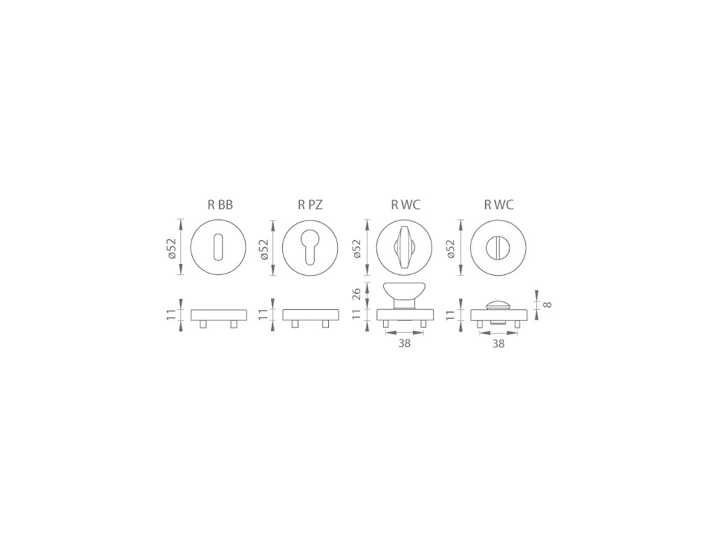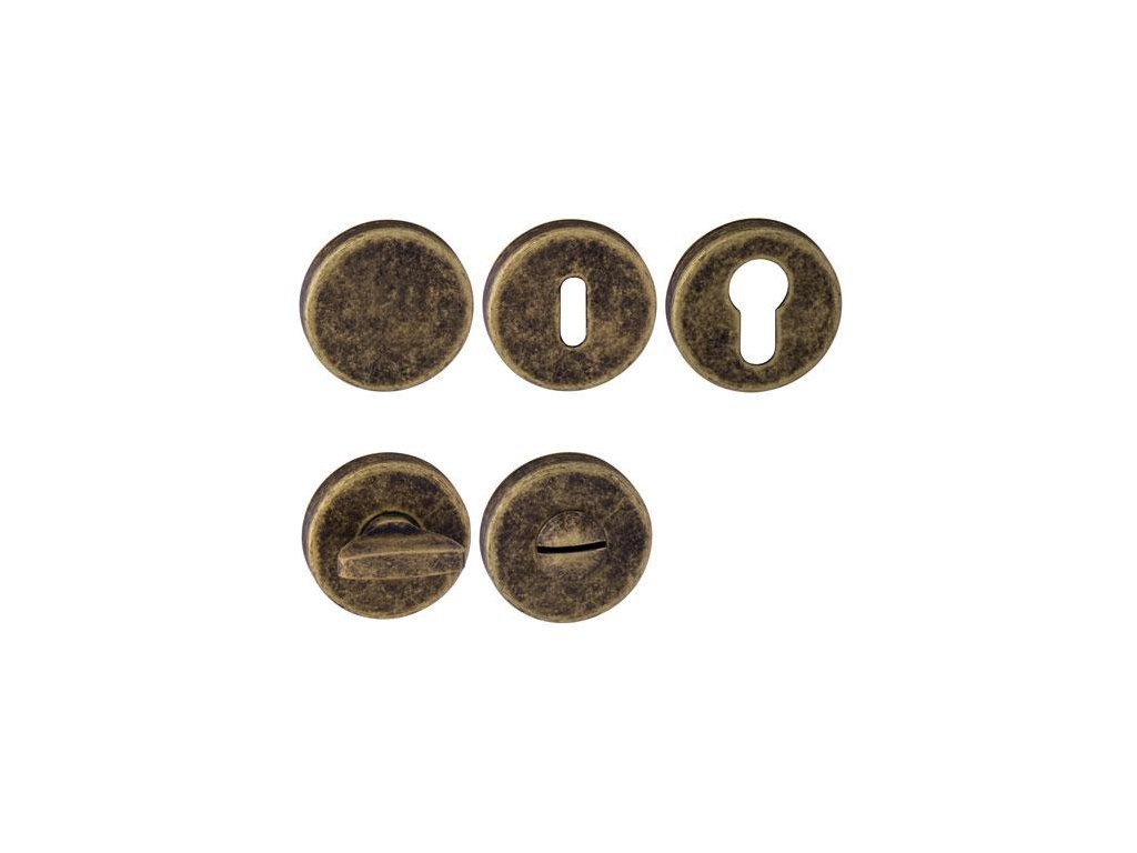 Kulatá rozeta je vyrobena z materiálů vysoké kvality - mosaz a je povrchově upravena. Rozeta má průměr 52 mm, tloušťku 11 mm a oválný otvor pro interiérový klíč (BB), otvor pro cylindrickou vložku (PZ), WC set s vmontovaným klíčem nebo rozetu bez otvoru tzv. záslepka. Balení obsahuje 2 kusy rozet (pár) a rozety WC jsou v balení jako set.