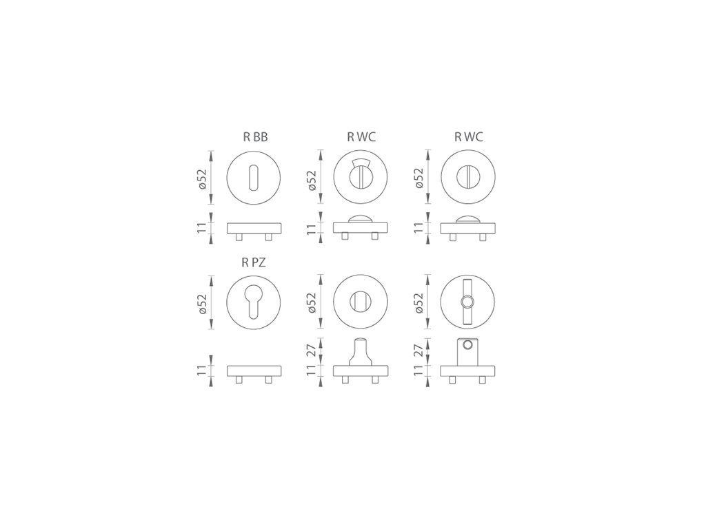 Kulatá rozeta je vyrobena z materiálů vysoké kvality - mosaz a je povrchově upravena. Rozeta má průměr 52 mm, tloušťku 11 mm a oválný otvor pro interiérový klíč (BB), otvor pro cylindrickou vložku (PZ), WC set s vmontovaným klíčem nebo rozetu bez otvoru tzv. záslepka. Balení obsahuje 2 kusy rozet (pár) a rozety WC jsou v balení jako set.