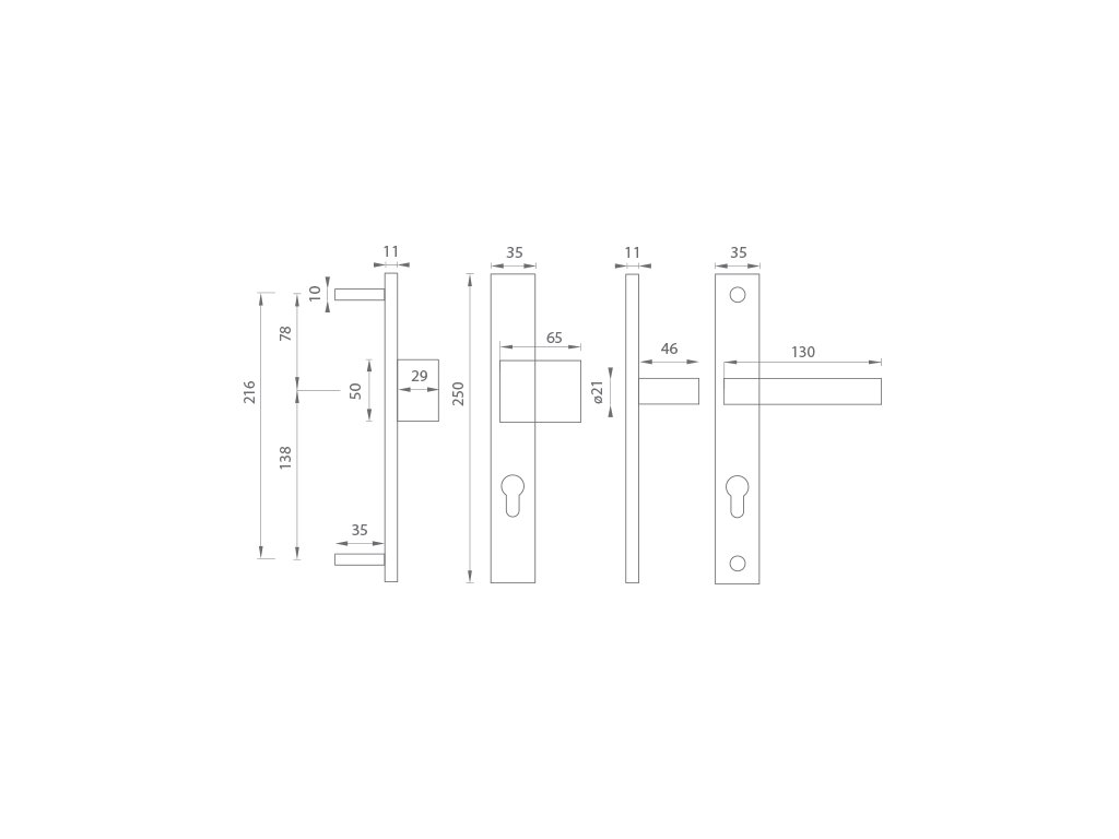 Štítová klika na vchodové a bezpečnostní dveře se zpevněným hranatým úzkým štítem bez překrytí cylindrické vložky je vyrobena z materiálů vysoké kvality - zamak a je povrchově upravena. Hranatý úzký štít má rozměry 35 mm x 250 mm a tloušťku 11 mm.