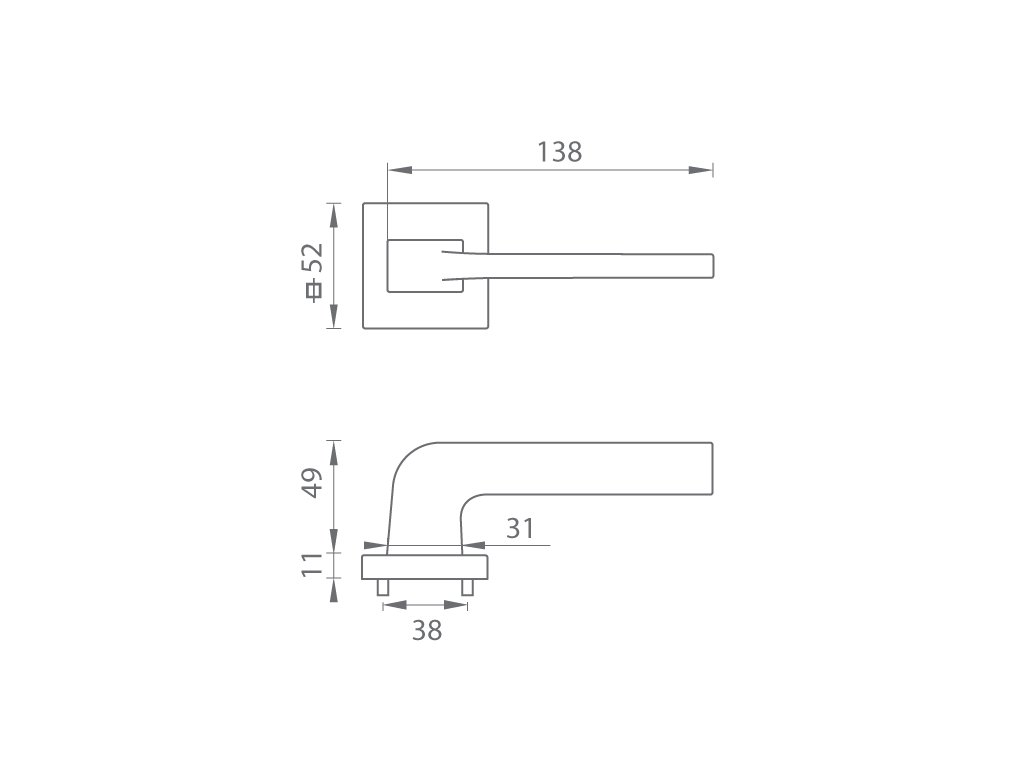 Rozetová klika na interiérové dveře s hranatou rozetou je vyrobena z materiálů vysoké kvality - zamak a je povrchově upravena. Rozeta má rozměry 52 mm x 52 mm a standardní tloušťku 11 mm.