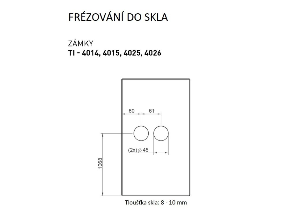 Zámek je vhodný pro skleněné dveře s tloušťkou 8 – 10 mm. Otvor pro kliku obsahuje vymezovací mechanismus pro maximální eliminování vůle čtyřhranu. Mechanismus zámku umožňuje nastavení síly pružiny a napomáhá udržování kliky v horizontální poloze.