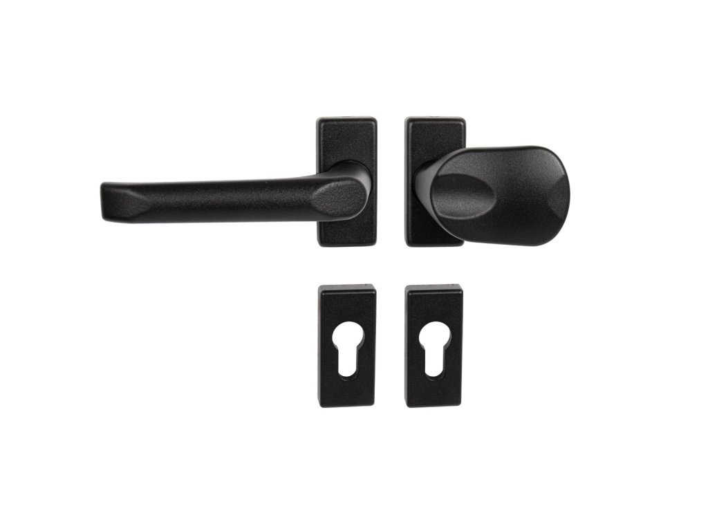 Rozetová klika na vchodové a bezpečnostní dveře se zpevněnou hranatou úzkou rozetou bez překrytí cylindrické vložky je vyrobená z hliníku a je povrchově upravená.