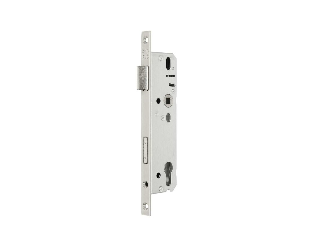 Zámek dveřní zadlabací vložkový jednozápadový s převodem, pro plastové dveře.