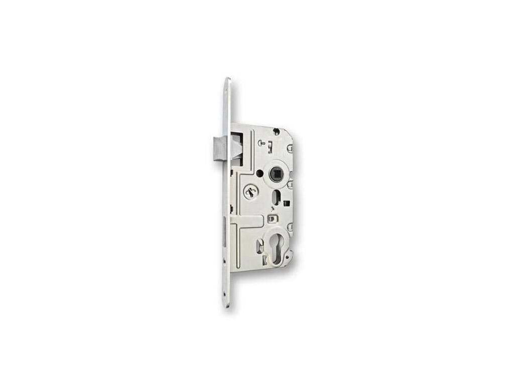 Zámek dveřní zadlabací vložkový, s plastovou střelkou a závorou, jednozápadový.